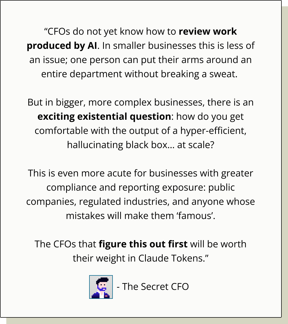 There is no question that AI is going to crush a ton of entry and mid-level work in finance. So the question is, what does the review and governance mode need to look like for that work? And how does it get done? Will it just change how CFOs review AI-produced work? Or will it also increase the review process as work gets done in a different way? The answer will drive what the future CFO org design looks like.